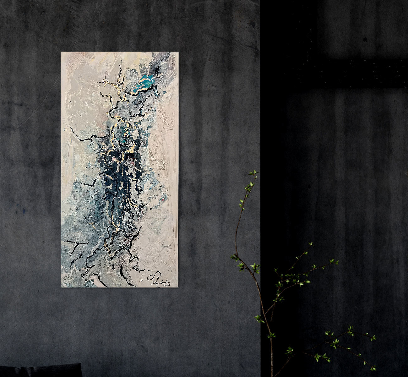 Delon Govender, After the Fires - Liquid Spirit Series, 2018. Fluid abstract acrylic pour and 24 karat gold art on canvas, 900mm(h) x 450mm(w).