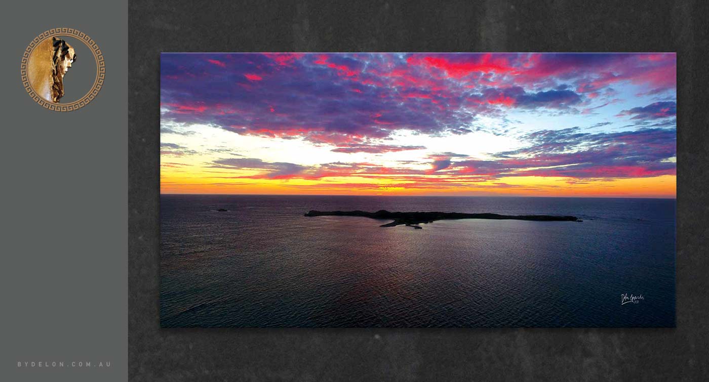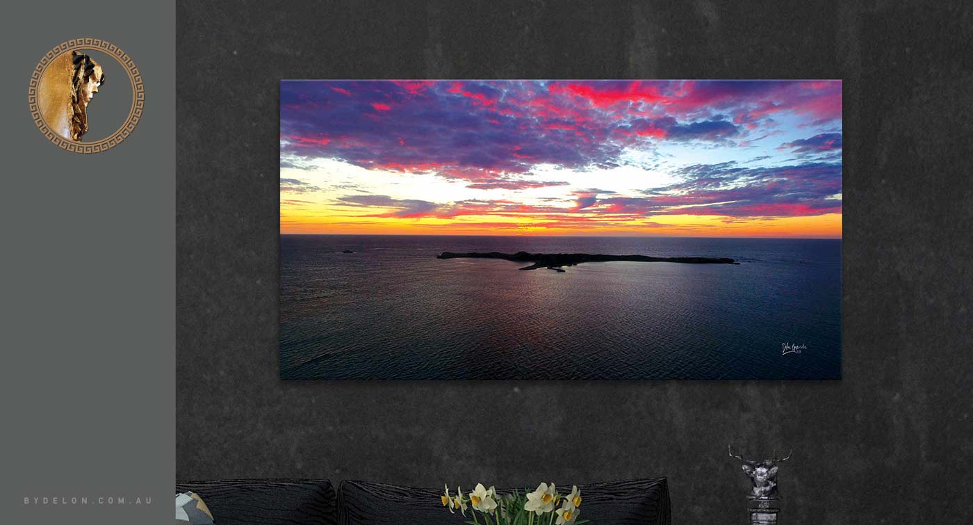 Flaming Skies over Penguin Island, Shoalwater Islands Marine Park - Stunning landscape photography of Rockingham's beautiful coastline - a simply gorgeous sunset that has a rather dramatic sky set against the cool rippling waters of the bay. This aerial photograph gives a uniquely stunning perspective of this West Australian Marine Park and is available for print in a selection of canvas sizes - unstretched (rolled canvas perfect for postage) and stretched (ready to hang).