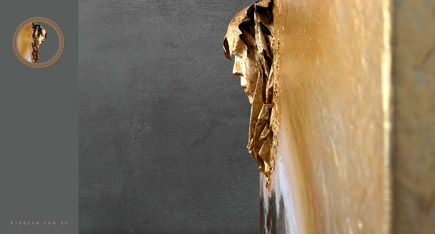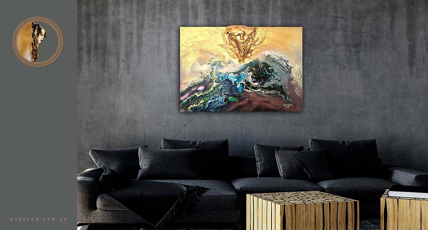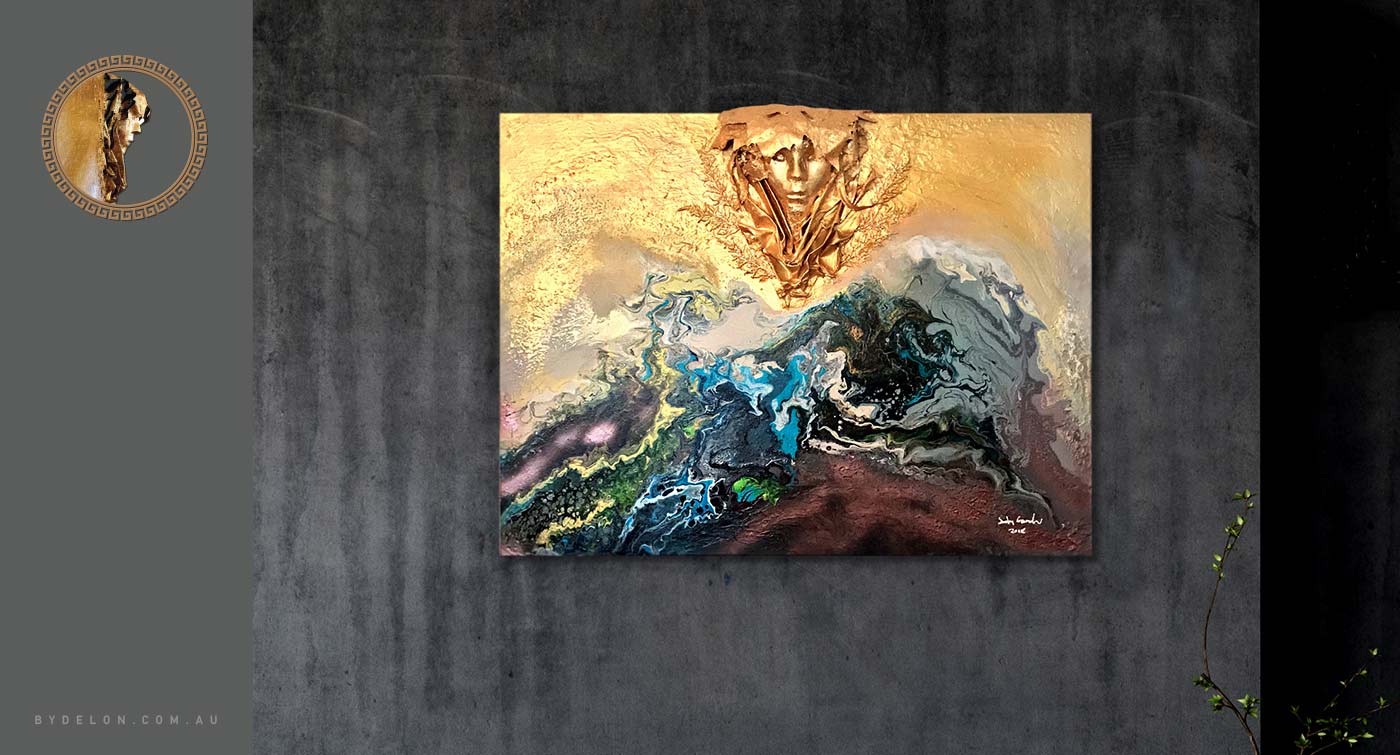 "Human Nature" is a fabulous mixed media collage with 24 k gold overlay on canvas by Delon. This contemporary work of art was conceptualised when the artist was in the process of putting out a kid's party mask along with other items into the recycle bin. He looked at the mask and thought, so much energy used in the manufacture of this object, and only after a single-use, it's about to be discarded. As he strolled back to the studio, he pondered...tbc