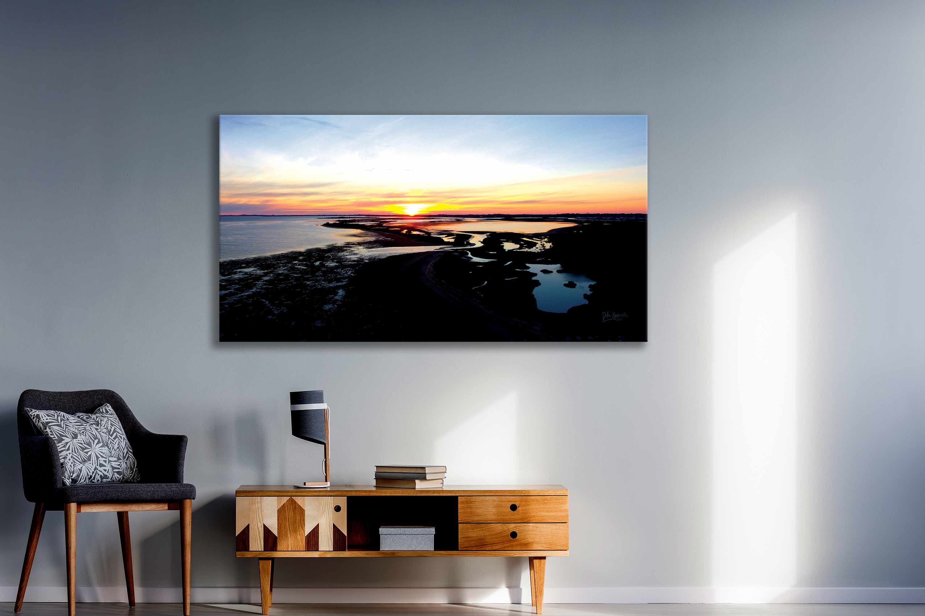 A truely marvelous aerial image of WA's remarkable coastline captured at the magical time of the sun just ducking beneath the horizon line at sundown. This beautiful image brings with it a sense of optimism and hope, a beautiful hello to the encroaching darkness as daylight fades and the mystery of night approaches at Collins Pool, Mandurah - contemporary & modern this aerial photographic print is available in a selection of canvas sizes - unstretched (rolled canvas perfect for postage) and stretched (ready to hang).