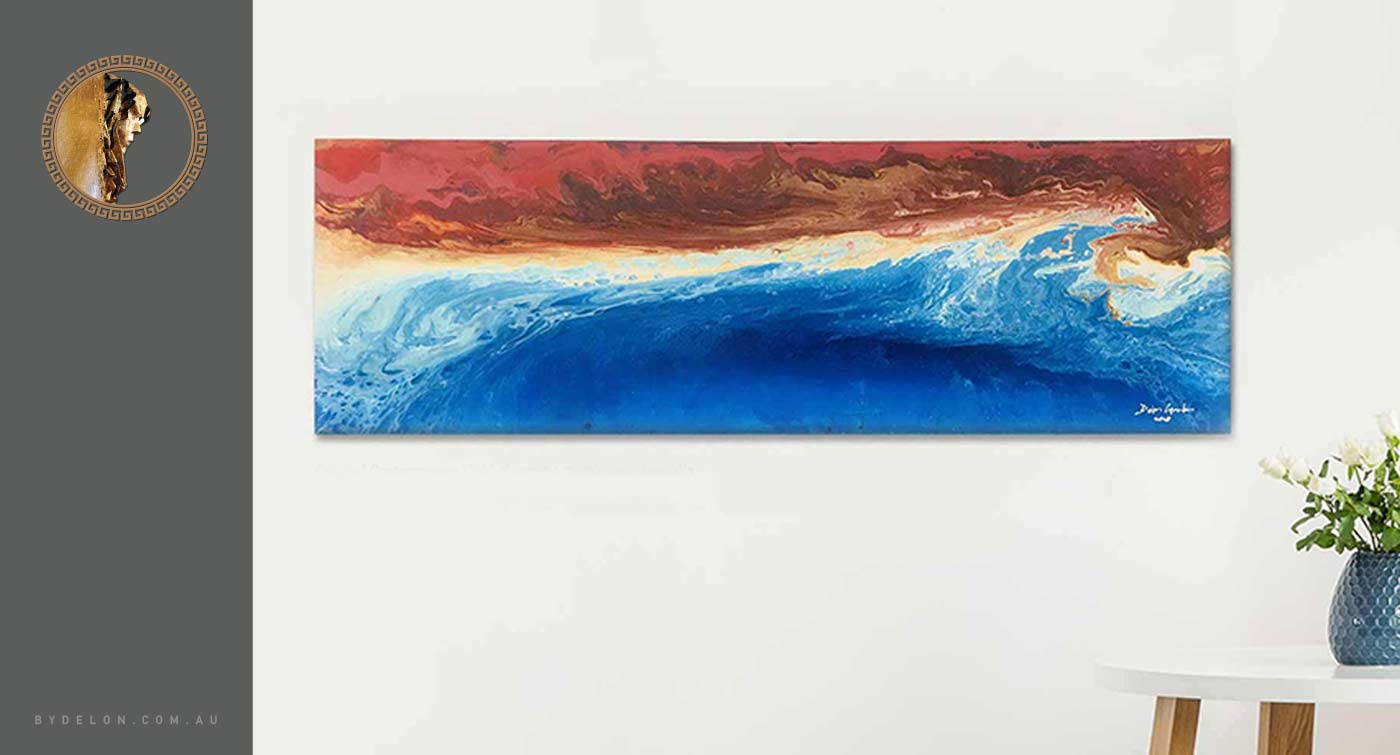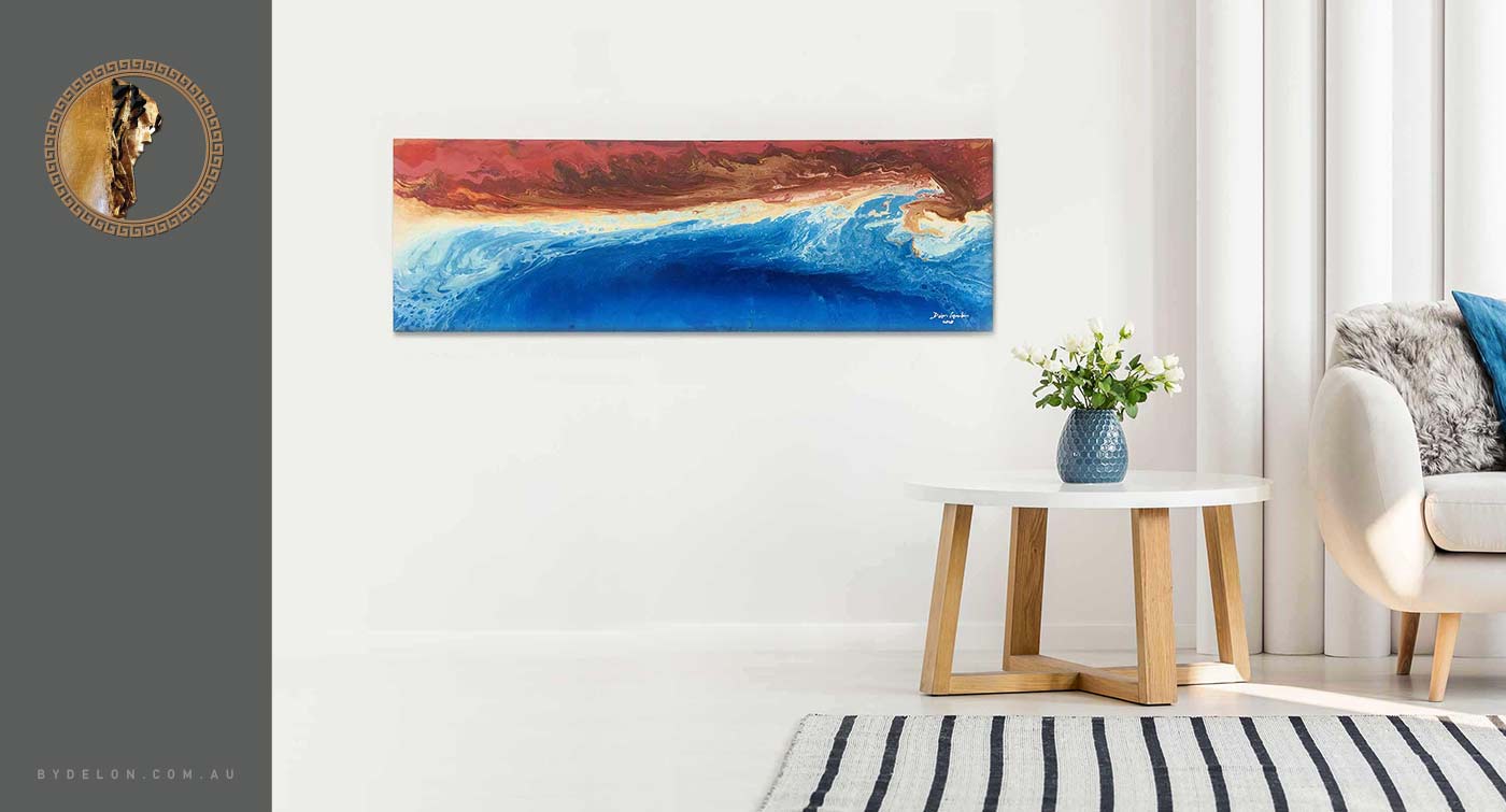 Its remoteness is a drawcard for many and is reminiscent of the romanticised Australia visitors envision. Delon's love for the WA landscape was the inspiration for this beautifully created artwork of red outback earth meeting the brilliant blue coast in the Pilbara.