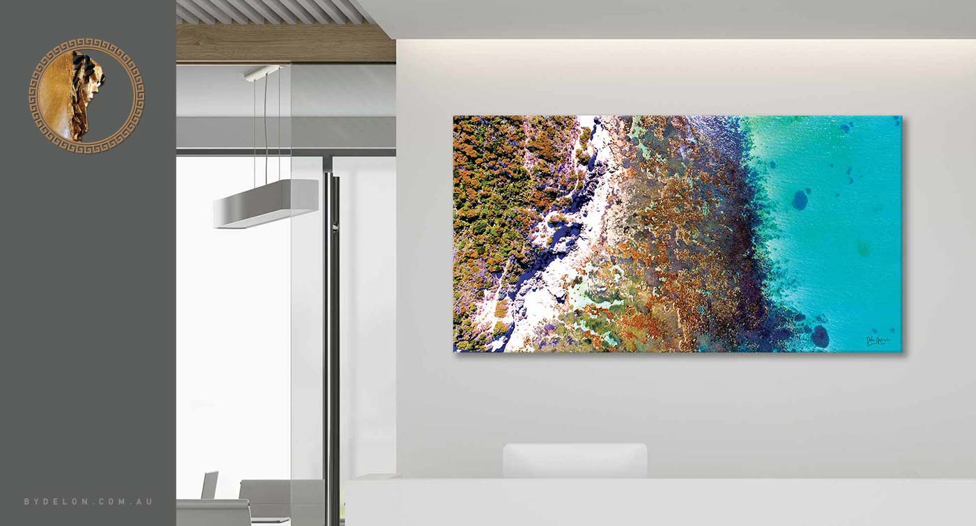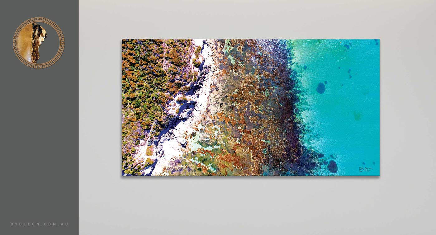 Picturesque birds-eye view aerial photograph of the WA coastline in all it's beauty. The gorgeous crystal clear water in cooling shades of blue showcase the colourful reef just beneath it's surface and meets with the pristine shoreline that is Cape Peron Beach, Rockingham. This contemporary & modern aerial coastal landscape canvas print is available in a selection of canvas sizes - unstretched (rolled canvas perfect for postage) and stretched (ready to hang).